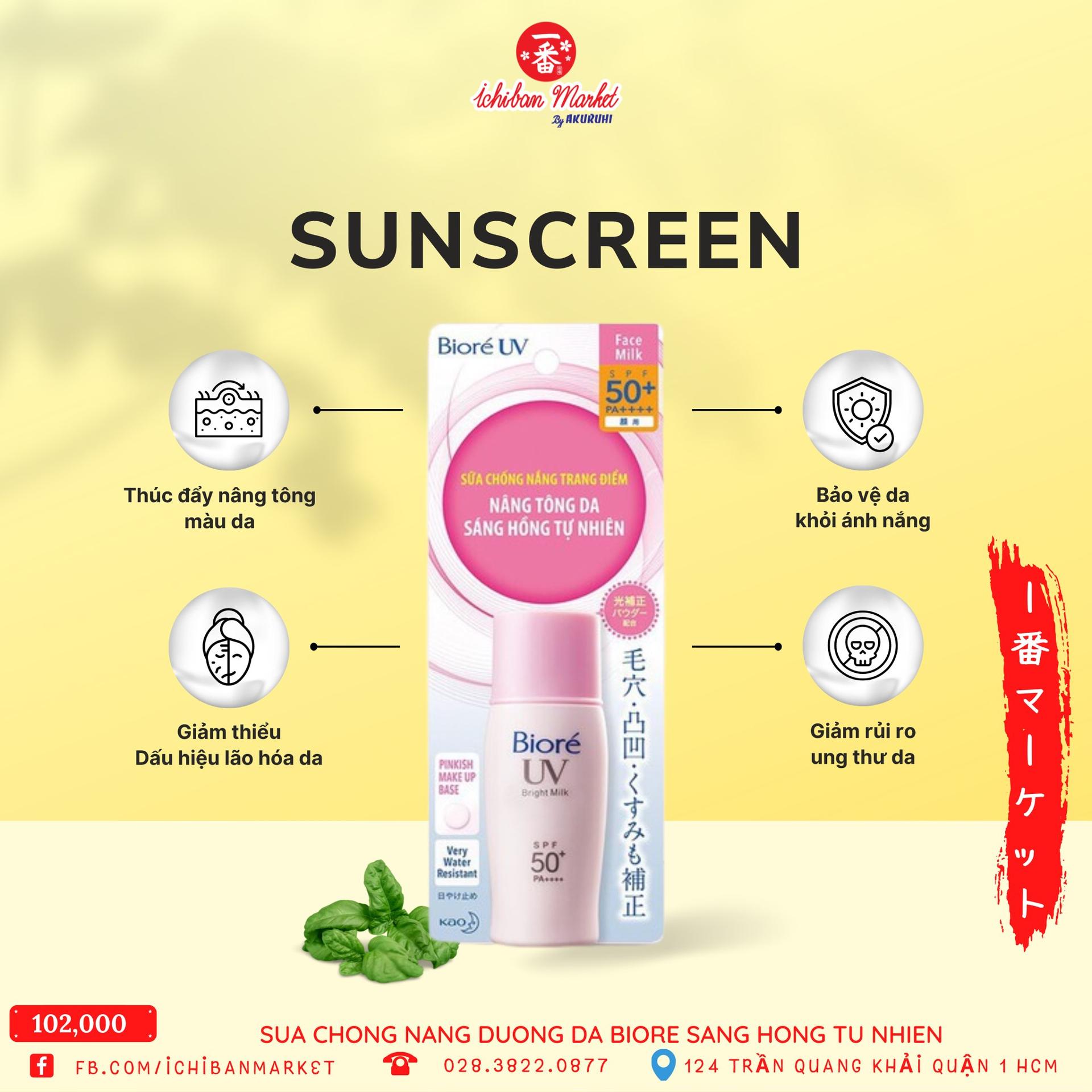 Sữa chống nắng dưỡng da BIORÉ sáng hồng vừa bảo vệ làn da khỏi tác hại từ ánh nắng mặt trời, vừa làm da trở nên trắng hồng rạng rỡ, tự tin xuống phố với gương mặt sáng đẹp. Sản phẩm với công thức dạng sữa che khuyết điểm, sử dụng như kem lót trang điểm giúp che lỗ chân lông và các khuyết điểm trên gương mặt cho làn da trắng hồng và rạng rỡ trông thấy.