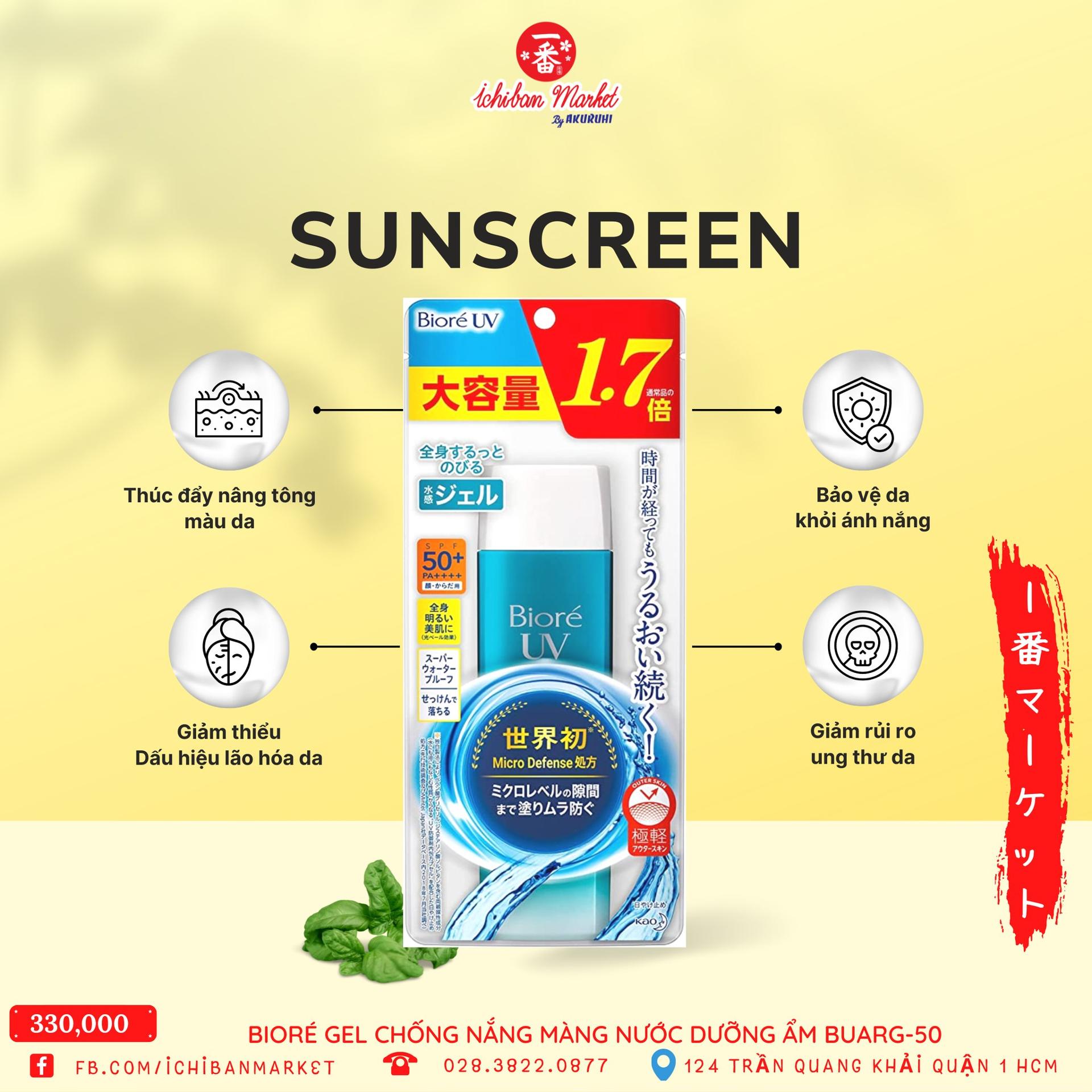 Gel chống nắng Bioré màng nước dưỡng ẩm BUARG-50 thích hợp cho người thường xuyên vận động ngoài trời, chơi thể thao, hay ra mồ hôi. Công nghệ Micro Defense – Màng Chắn Vi Điểm độc quyền từ Biore giúp che phủ cả những điểm siêu nhỏ trên bề mặt da mà mắt thường không nhìn thấy được. Dạng gel tươi mát, dùng như lót trang điểm giúp da trông sáng hơn. Sản phẩm dùng được cho mặt và toàn thân. Dành cho mọi loại da.