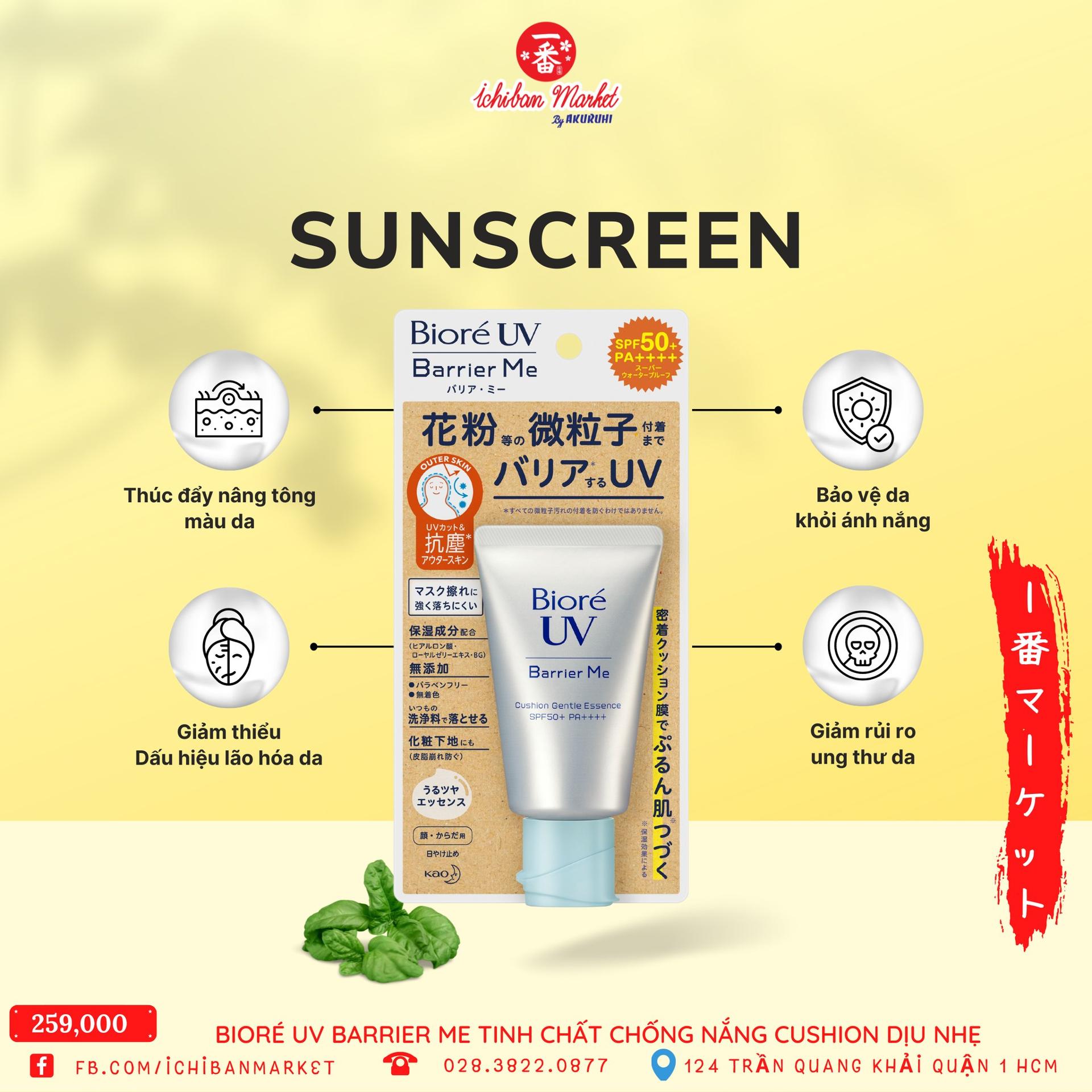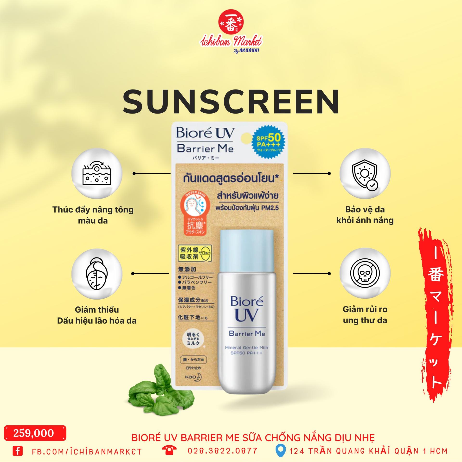 Kem chống nắng BIORÉ UV BARRIER ME “em” này có khả năng chóng nước, không nâng tone, dịu nhẹ. Với chiết xuất sữa ong chúa, giúp chống nắng hiệu quả, ngăn tối ưu tác hại của tia UV. Sản phẩm còn giúp làm sáng da và làm mịn da.