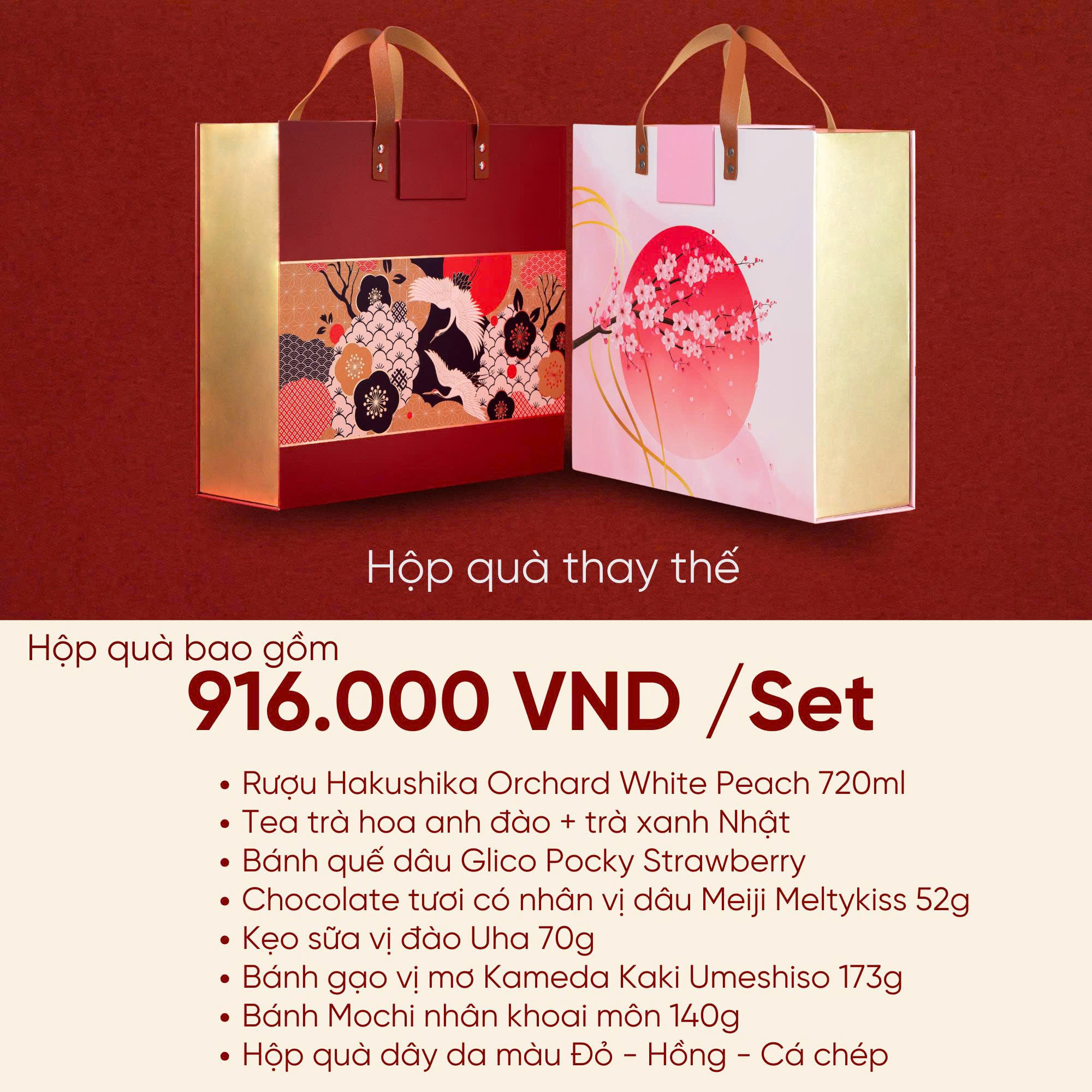 Hộp quà Tết Mikura cao cấp giá 916.000 VNĐ. Bao gồm Rượu Đào Hakushika, Chocolate Meiji Meltykiss, Bánh Glico Pocky, Kẹo Uha. Hộp da Đỏ – Hồng, họa tiết Cá Chép/Hạc Vũ. Món quà Đắc Lộc Khai Xuân!