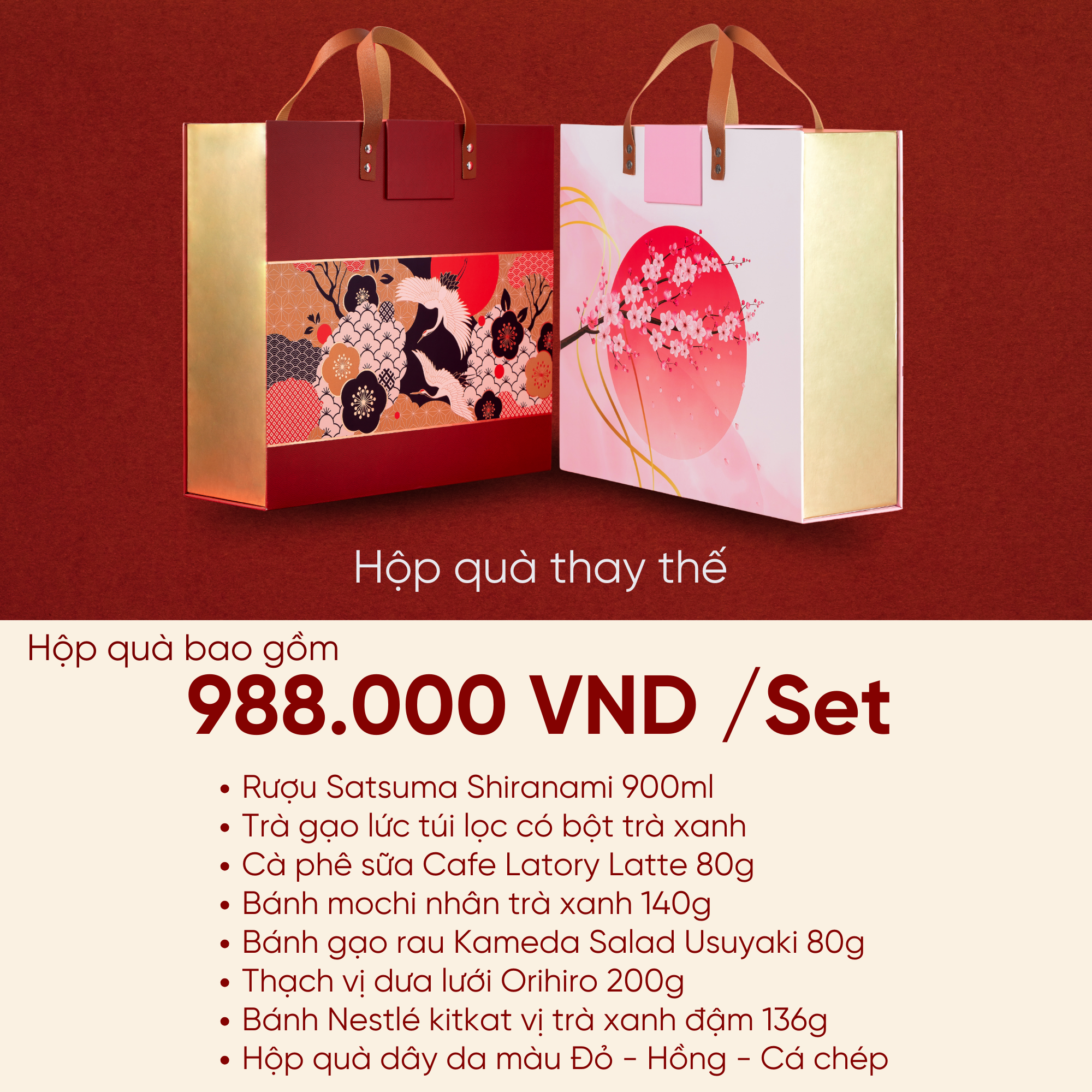 Lưu ý: Quý khách có thể thay đổi mẫu hộp quà cứng cáp với họa tiết Anh Đào Nhật Dương hoặc Hạc Tiên sang trọng